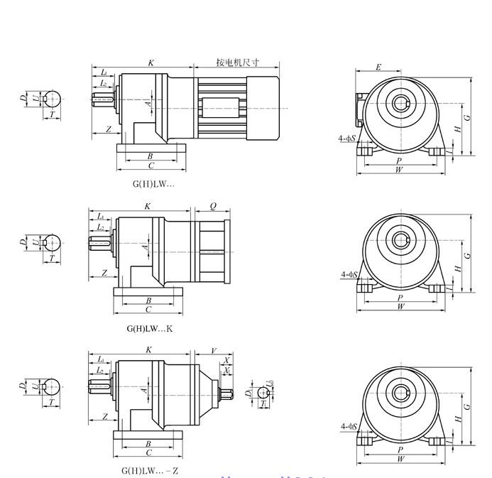 注:箱體材料:L—鋁合金、H—鑄鐵 安裝型式:W—底腳式、F—法蘭式 標志示例: A GHWZ40-50 雙軸鑄鐵箱體臥式,40機型號,減速比50 B GLF28-550-50 立式名合金箱體、28機型號、直聯專用電機55W,減速比50。 C GLW28K-80B85-30 臥式鋁合金箱體,28機型號,輸入端IEC標準電機法蘭80B5,減速比30 三、結構圖例: