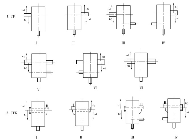 按輸出軸分,TF可分為Ⅰ、Ⅱ、Ⅲ、Ⅳ、Ⅴ、Ⅵ、Ⅶ七種裝配型式,TFK可分為Ⅰ、Ⅱ、Ⅲ、Ⅳ四種裝配型式。如需配逆止器時請注明(一盤為自配),