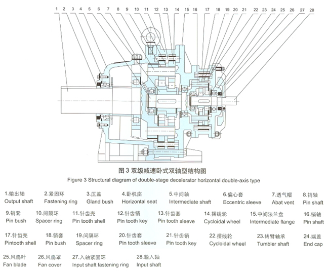 3.結(jié)構(gòu)緊湊,體積小,重量輕。體積和普通圓柱齒輪減速機(jī)相比可減小2/1–2/3。