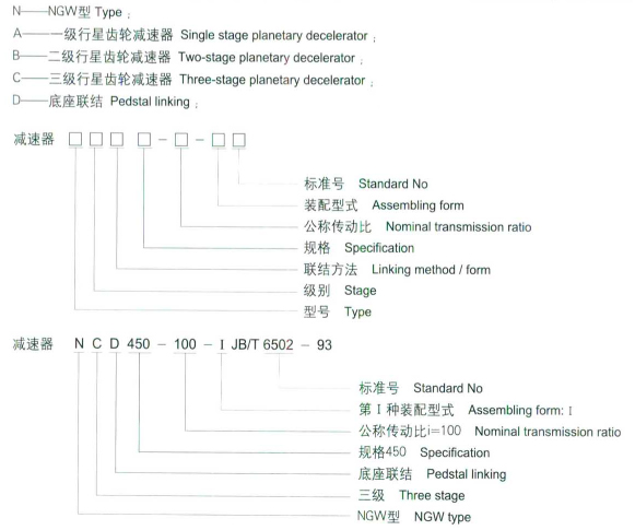 其標記符號:Symbol include:type,stage no,linking,form,nominal transmission ratio,assembling form,standard no。